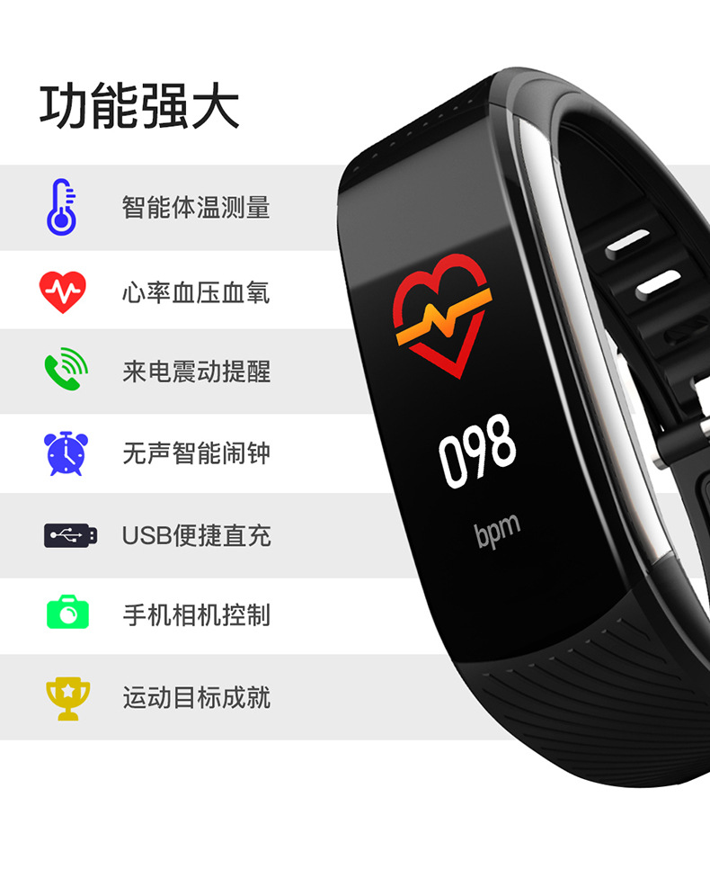 产品卖点:体温监测、心率、血压、血氧、睡眠测量。更多实用性功能:来电提醒、来电拒接、信息推送、天气显示、秒表、摇一摇拍照、手环手机双向查找,5种运动模式(跑步、骑行、跳绳、羽毛球、乒乓球),4档亮度调节,3个UI界面切换