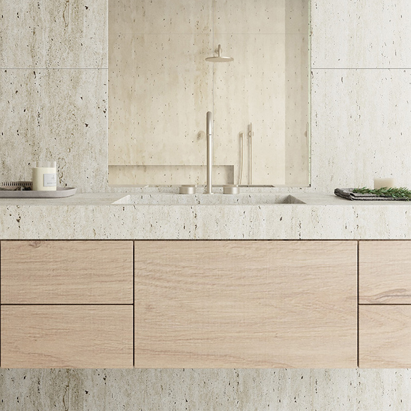 佛山市西芒陶瓷有限公司发布的侘寂风微水泥米黄奶油色洞石柔光瓷砖客厅厨房浴室卫生间墙砖地砖图集库