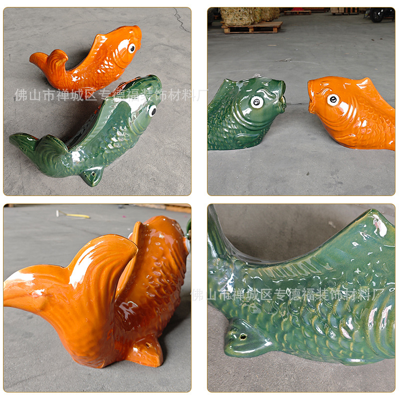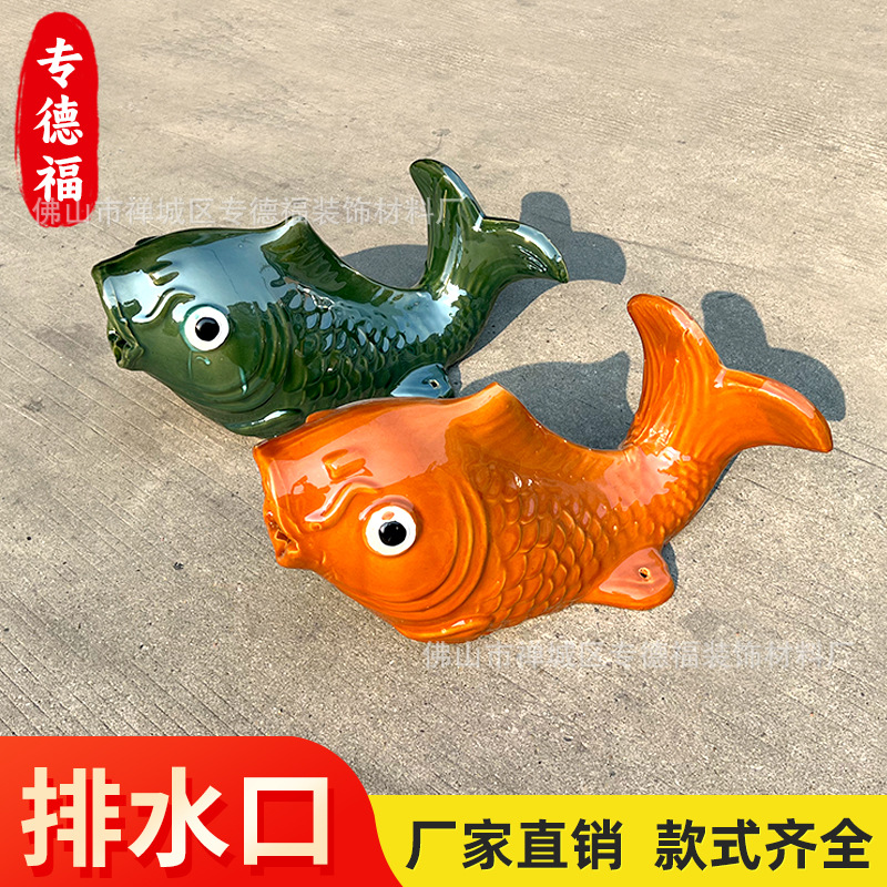 寿光市奥瑞防水材料有限公司发布的大号陶瓷鲤鱼排水口房顶出水鱼嘴琉璃瓦外墙喷泉鲤鱼喷水滴水挂件图集库